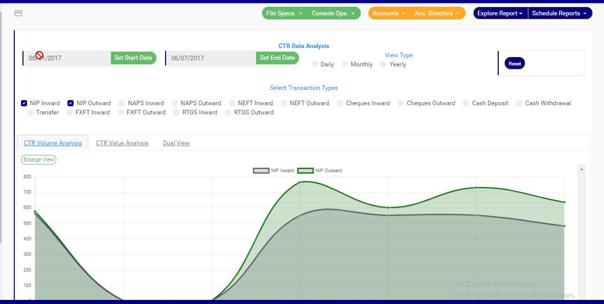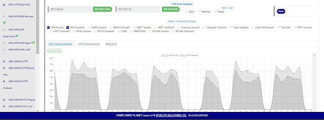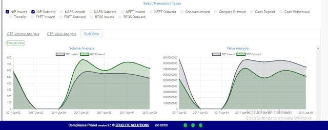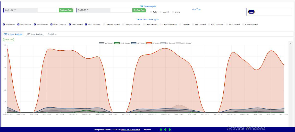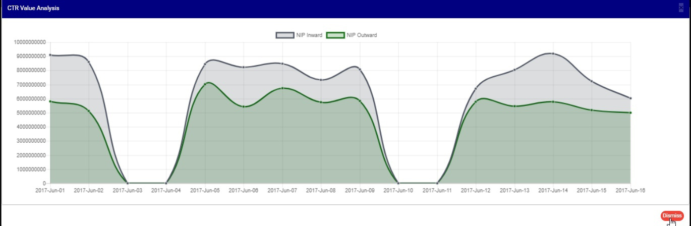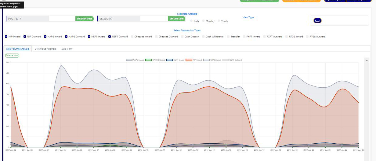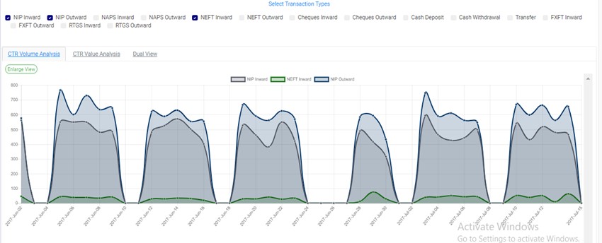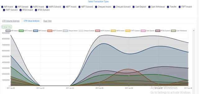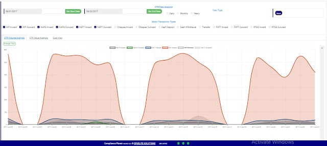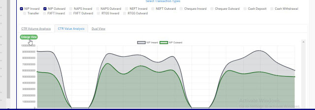 STEP 6: Click on CTR Volume Analysis or CTR Value Analysis or Dual View to see analysis based on volume of transactions or value of transactions or value and volume together, respectively. The volume analysis button and the value analysis button only change parameters on the y axis to number or amounts.