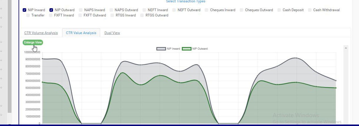 ➔ By clicking on the CTR Value Analysis, the graph analysis will be according to the amounts (in naira) of the transactions that occurred in the period you specified in your date settings. Look at fig. 2.5o below for an example on NIP Inward value analysis.
