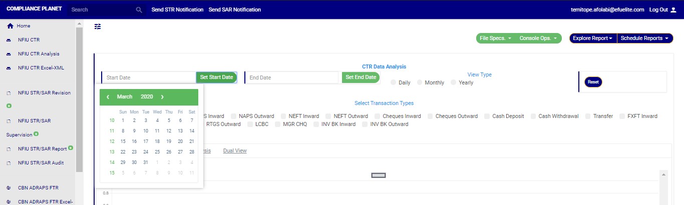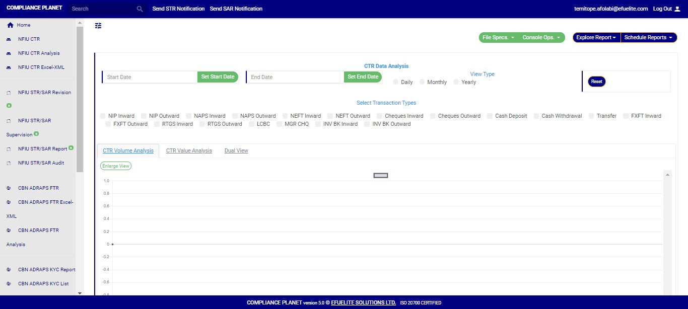 STEP 2: Clicking on NFIU CTR ANALYSIS will display a page as in fig. 2.5b below. On this page, you will find features to set date, select transactions, set different periodic views, enlarge graph view and set parameters of graph.