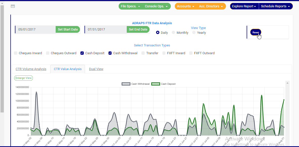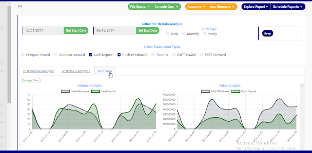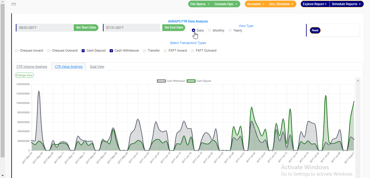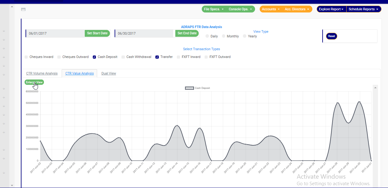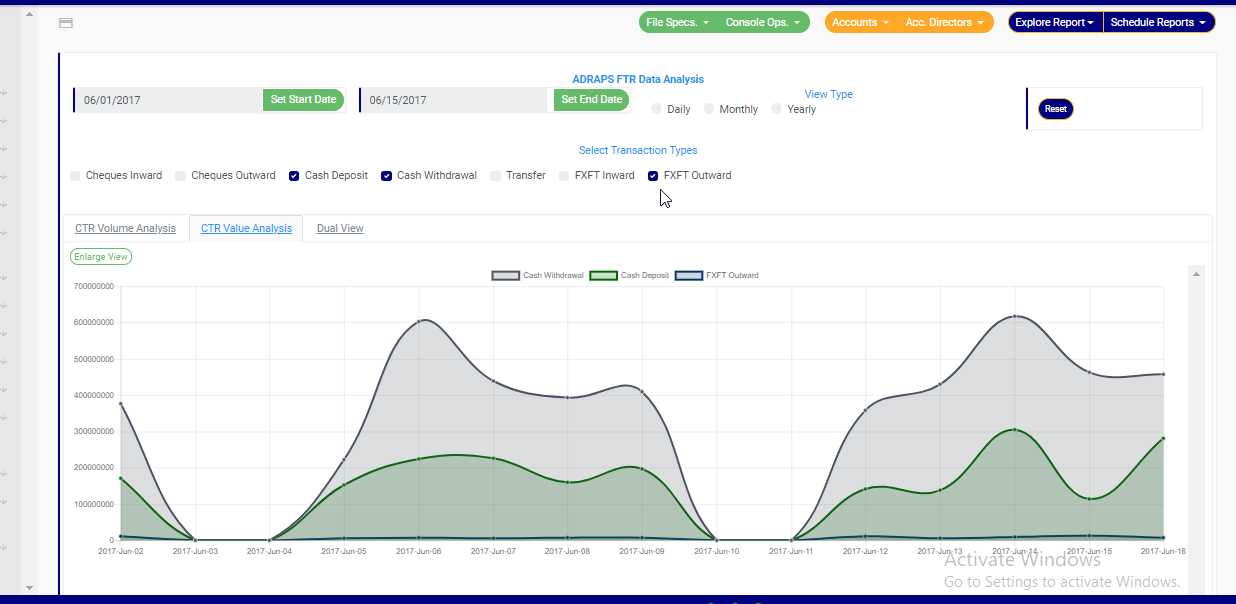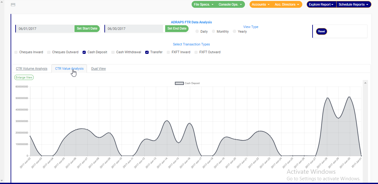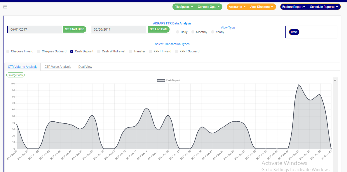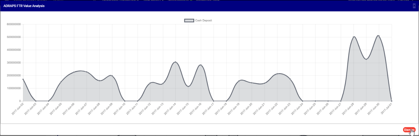STEP 3: Tick the checkbox ◻ of the FTR type(s) you want to view. As soon as you select a transaction type, the software processes it and displays a graph instantly. Fig. 3.6e below is an example for Cash Deposit ADRAPS FTR for 1st of June 2017 to 30th of June 2016.