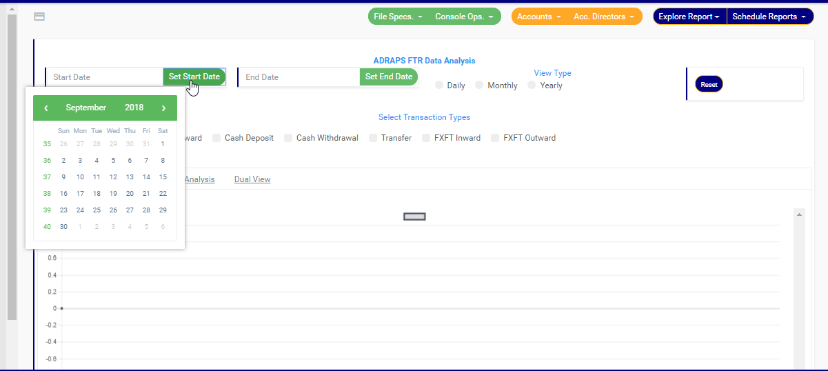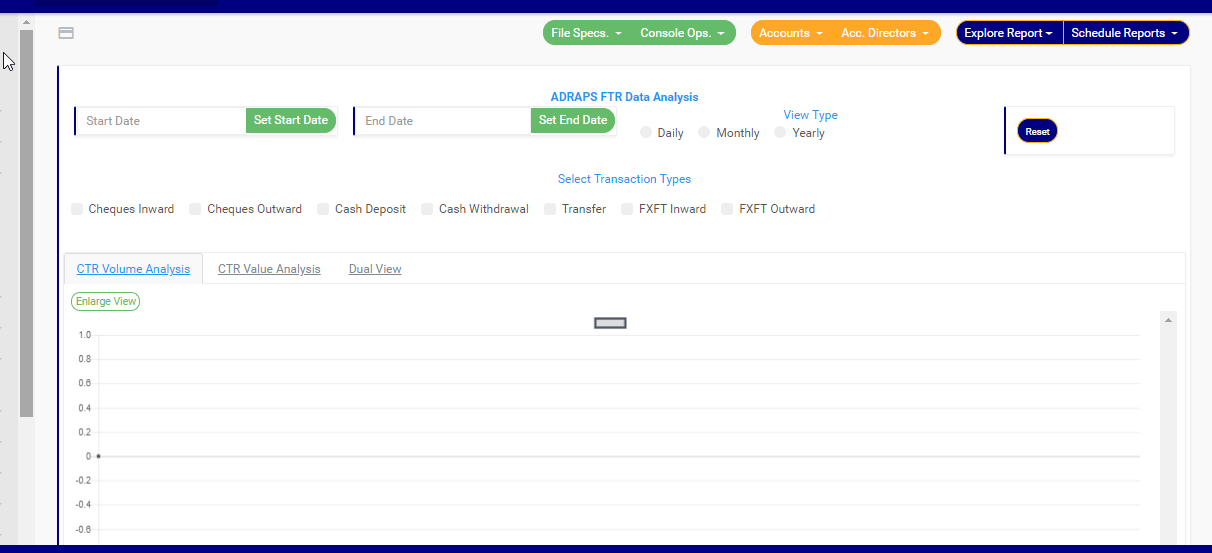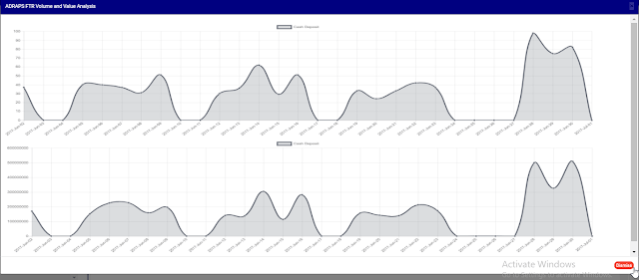 Here, the Software can generate graphs with the value and/or volume of transactions plotted against the time or period in which they occur. To get the software to give you an analysis of any ADRAPS FTR type over a period of time, here is how to go about it.