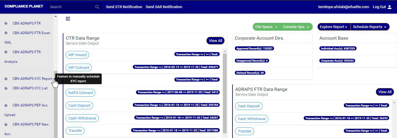 The compliance planet allows you to manually schedule your ADRAPS KYC report ahead of time and download them when they are completely processed. Here is how to do this.