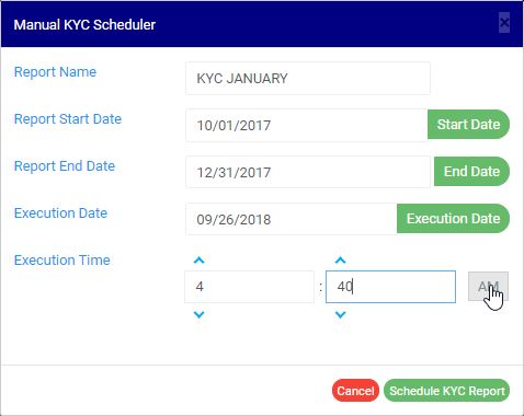 STEP 6: Click on ‘SCHEDULE KYC REPORT’ to create your report or CANCEL to close the console. These buttons are at the bottom-right corner of the console. See them in fig. 5.3h above.
