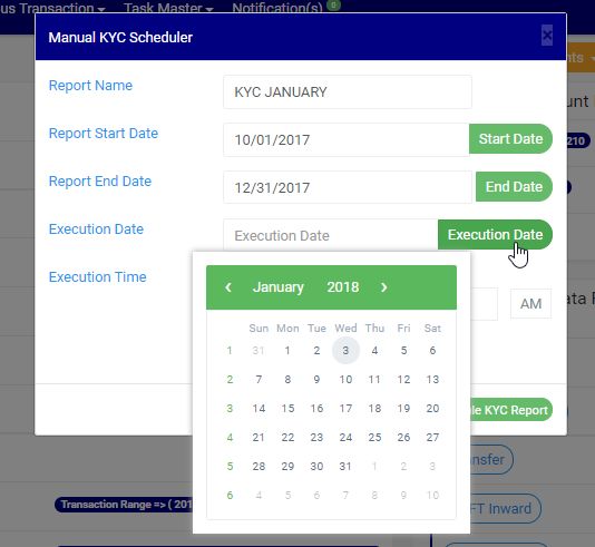 STEP 5: Click on the EXECUTION DATE button to select the date you want your ADRAPS KYC report to be processed, from a calendar as shown in fig. 5.3g. The calendar also works like the one in fig. 5.3e above.