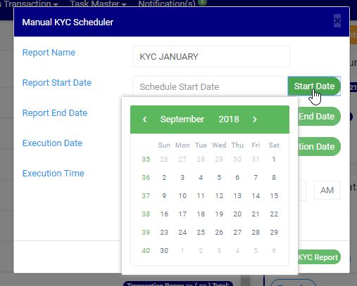 STEP 3: Click on the REPORT START DATE button to select the date that begins the period for which you want to generate an ADRAPS KYC report from a calendar as shown in fig. 5.3d.