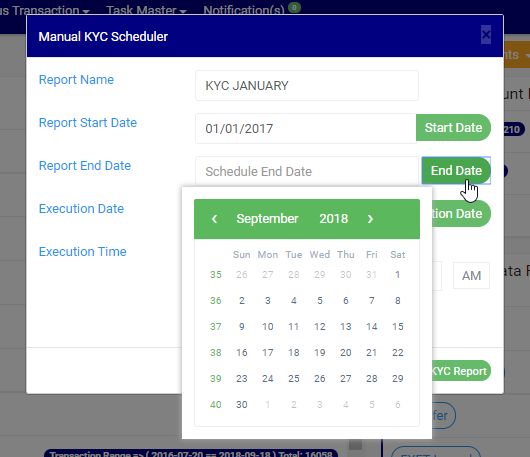 STEP 4: Click on the REPORT END DATE button to select the date ending the period for which you want to generate an ADRAPS KYC report from a calendar as shown in fig. 5.3f. The calendar works like the one in fig. 5.3e above.