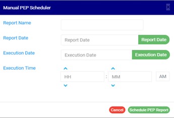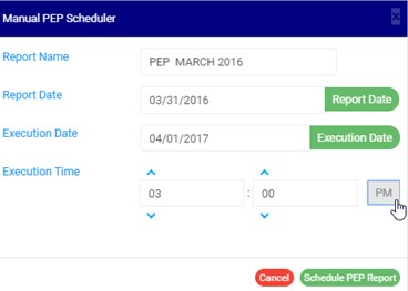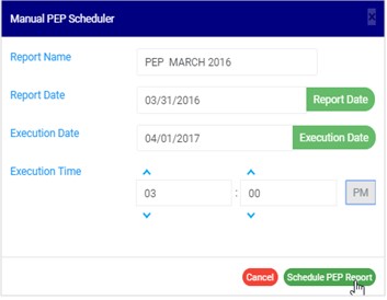 STEP 6: Click on ‘SCHEDULE PEP REPORT’ to create your report or CANCEL to close the console. These buttons are at the bottom-right corner of the console. See them in fig. 4.6f above.