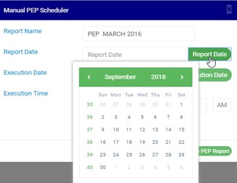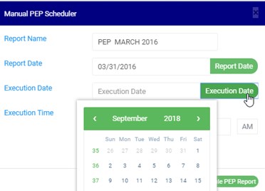 STEP 4: Click on the EXECUTION DATE button to select the date you want your ADRAPS PEP report to be processed from as shown in fig. 4.6e below. The calendar works like the one in fig. 4.6d above.