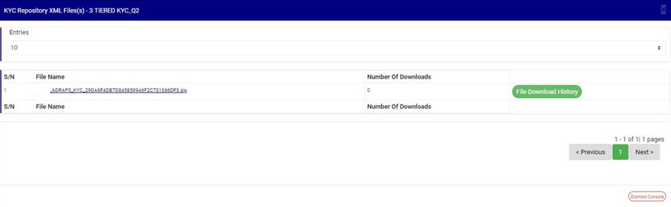 d) At the the bottom-right corner of the KYC Repository XML file(s) page, the software also gives information about the number of pages of the KYC Repository XML file(s) list, with the page numbers written out. All the page numbers represent buttons for each page. By clicking on any page number, the software takes you to that particular page. The NEXT button will take you to the page after the one you are viewing at the moment, while the PREVIOUS button will take you to the page before the one you are viewing at that moment. To close this page, click on the DISMISS button at the bottom-right corner of the page. See these features in fig. 5.4s above.