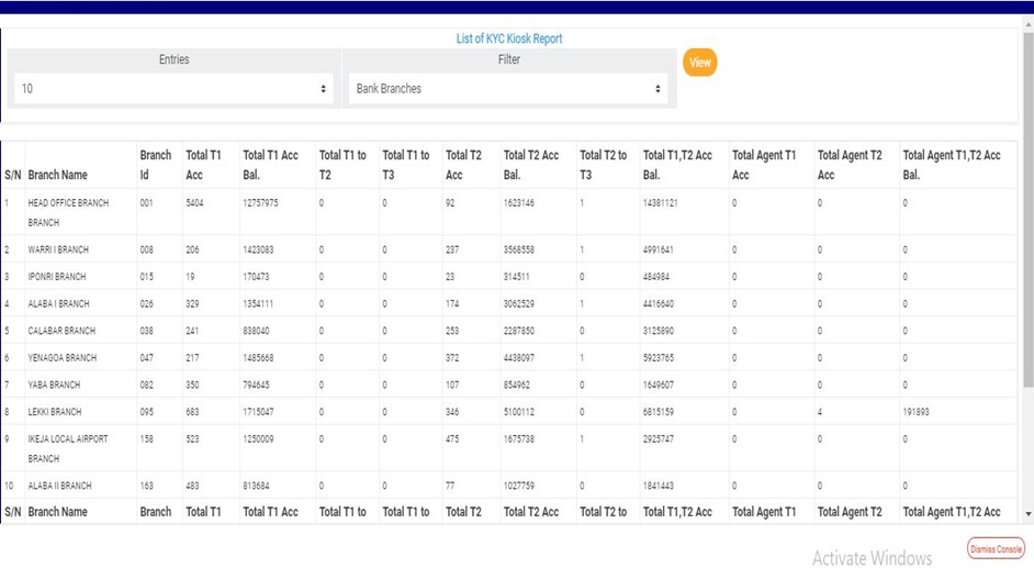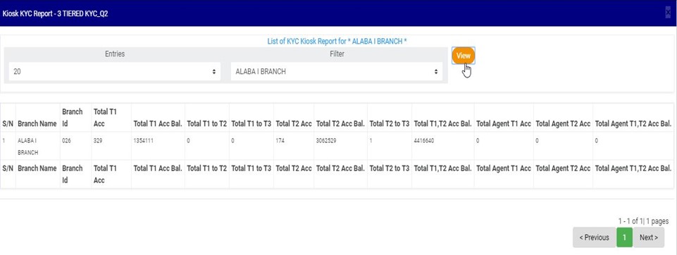 ➔ The numbers under the Kiosk Rpt column represent the number of branches reported in the KYC report. By clicking on Kiosk Rpt., a page titled, Kiosk KYC Report, will come up. Another name for branch on the compliance planet is kiosk. This page gives information about the branch’s ID, number of tier one accounts and tier two accounts, their total account balances and number of accounts that moved from one tier to another, for each branch reported in the ADRAPS KYC. See fig. 5.4h below.