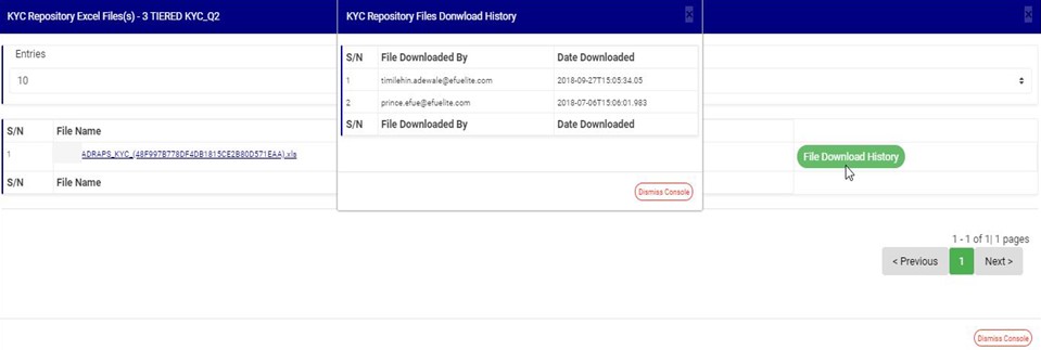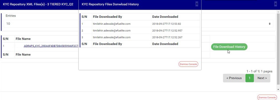 c) To see who downloaded the file and the time of download, click on the ‘File Download History’ button. A console will be displayed as in fig. 5.4s below for an example. Close the console using the DISMISS button at the bottom-right corner of the console.
