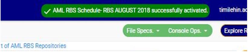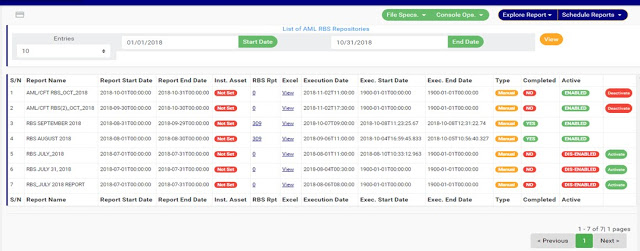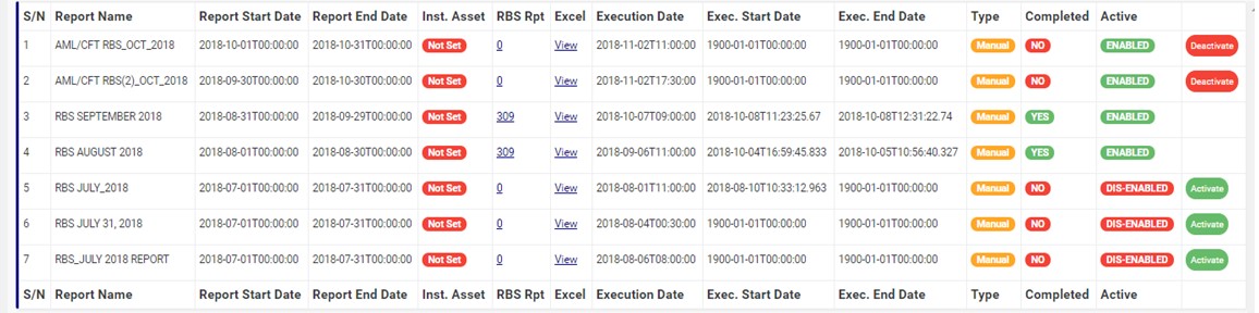 ➔ Back on the AML RBS Repository list page, at the end of each report row, the software shows if the processing of the report is enabled or dis-enabled under the ‘ACTIVE’ column.