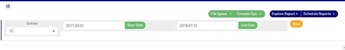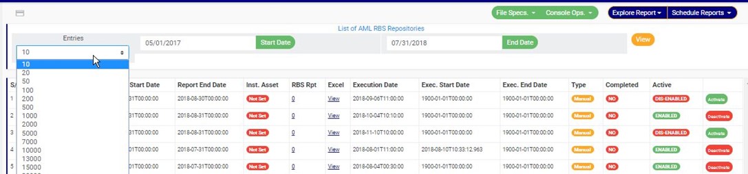 ➔ For instance to see AML RBS reports scheduled for dates between MAY 2017 and JULY 2018,, the start date and end date would be 05/01/2017 and 07/31/2018 respectively. See an example in fig. 7.4f below.