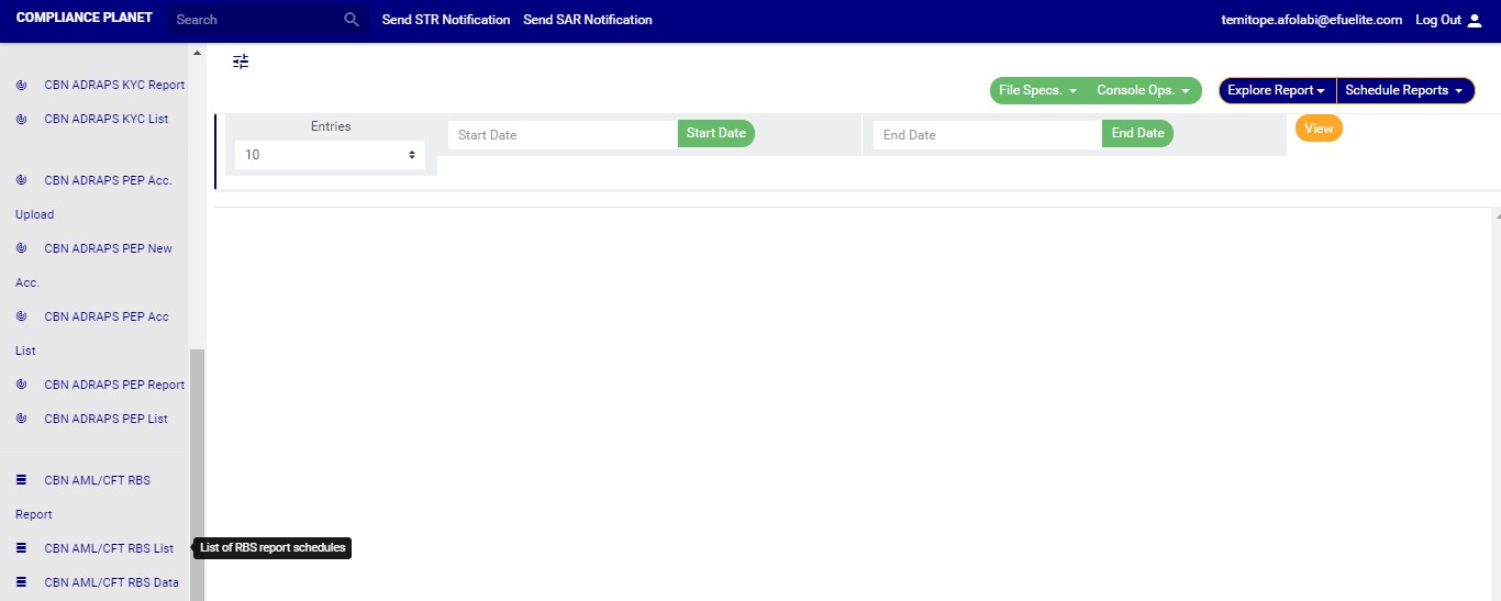 The Compliance planet software keeps a record of all AML RBS reports that have been manually scheduled. The process to find scheduled AML RBS reports and carry out other associated operations are described below.