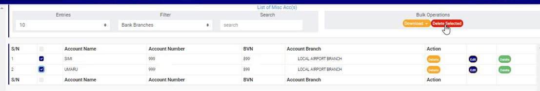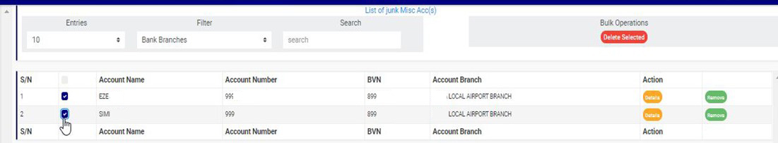 ➔ To select all the accounts, click on the checkbox of the table title bar, that is, the checkbox between ‘S/N’ and ‘ACCOUNT NAME’.