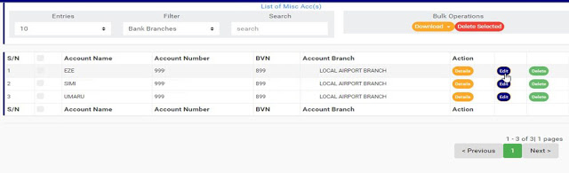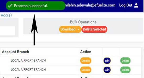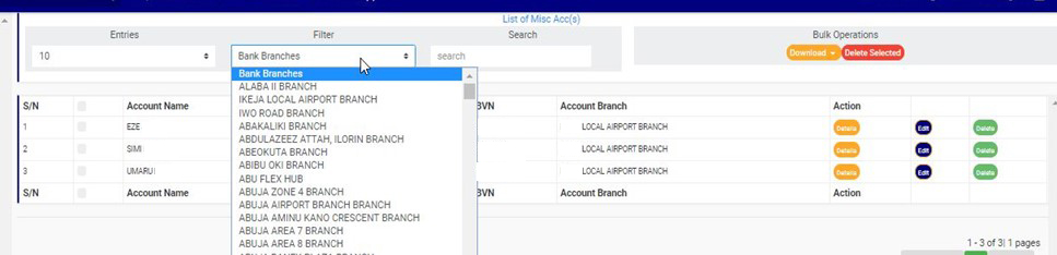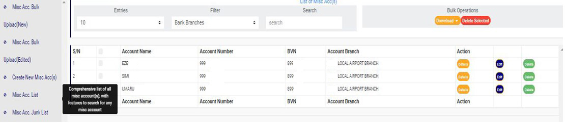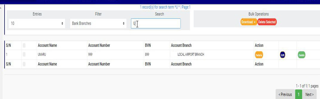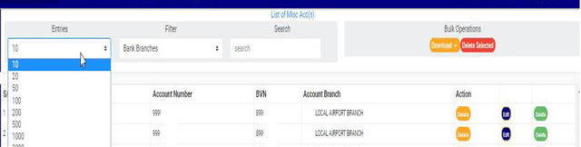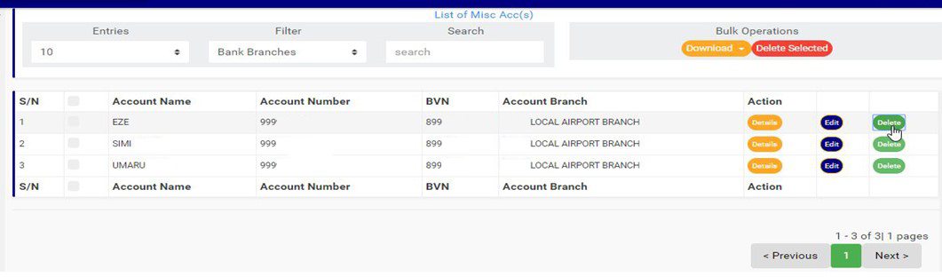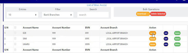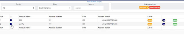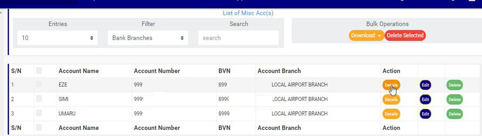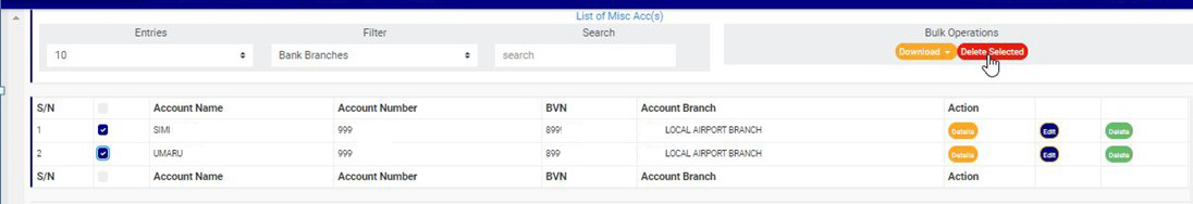 ➔ Also on this page, there are features to carry out bulk operations. Bulk operation refers to operations on more than one account at the same time. I.e. you can view details, delete and edit multiple accounts at the same time. The buttons for carrying out bulk operations are at the top-right area of the page as shown in fig. 8.6n above. These features are; ‘Download’ and ‘Delete Selected’.