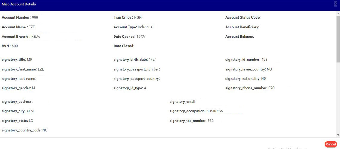 ● This will display a ‘Misc. Account Details’ console. Note, you can only view the details of the miscellaneous account. See an example in fig. 8.6g below. Click on ‘CANCEL’ to close the console.