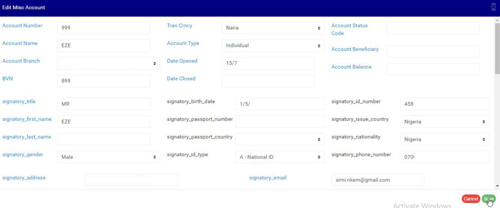 ➔ To modify the details of a miscellaneous account, click on ‘EDIT’ as in fig. 8.6h below. This displays a ‘Edit Misc. Account’ console where you can edit the details and/or input details in the fields that are yet to be filled.