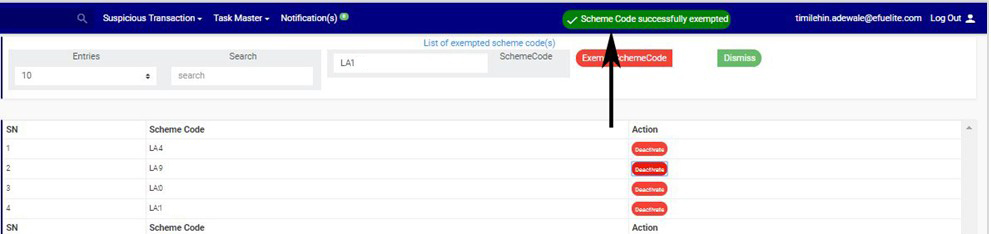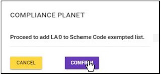 STEP 3: Click on ‘CONFIRM’ to add the account scheme to the exemption list or ‘CANCEL’ to discontinue. If you proceed, a notification will be displayed at the top of the page. See fig. 17.3d for an example.
