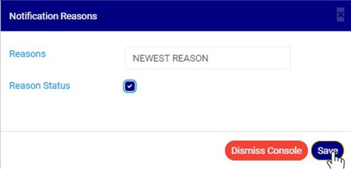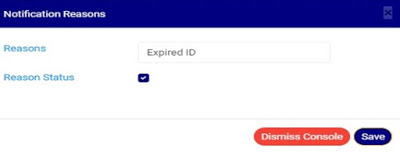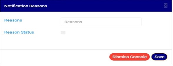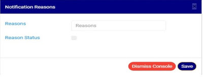 ➔ Clicking the EDIT button will display a console titled, ‘Notifications Reasons as shown in fig 21.2b below.
