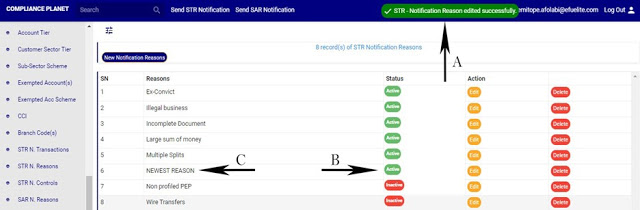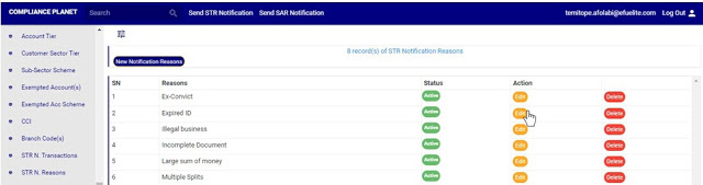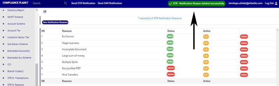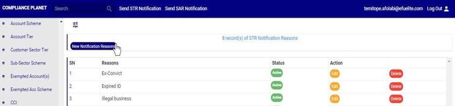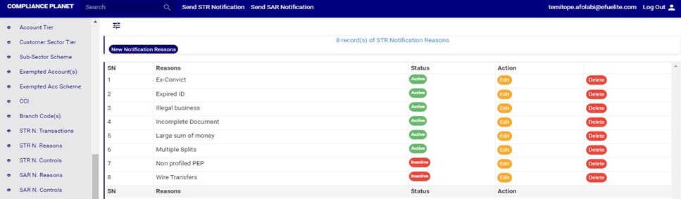 ➔ An active notification reason will form part of the available options when sending a new STR notification on the compliance planet software(See section 6.2.1 for sending an STR notification) while an inactive notification reason will no longer be available when sending a STR notification on the compliance planet software.