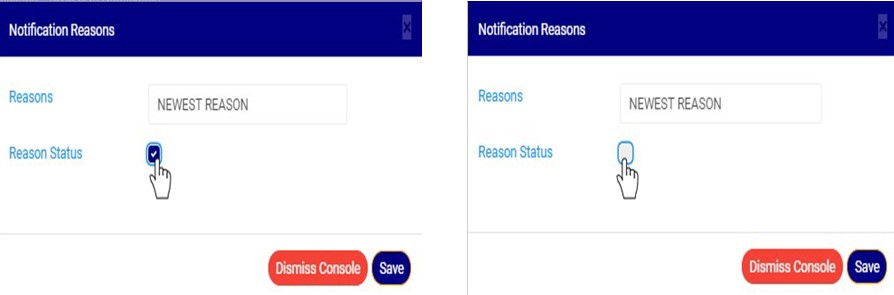 STEP 3: Click on the reason status checkbox to make that notification reason active or inactive. This is illustrated in Fig 21.2d and Fig 21.2e below
