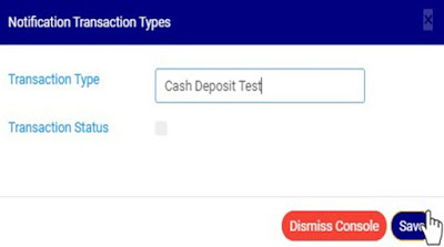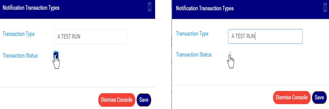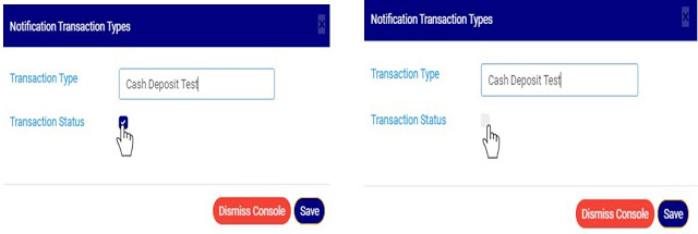 STEP 3: Click on the transaction status checkbox to make that transaction notification type active or inactive. This is illustrated in Fig 20.3d and Fig 20.3e below