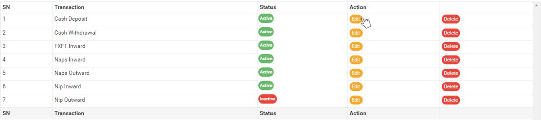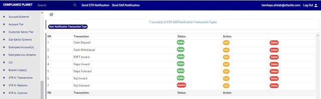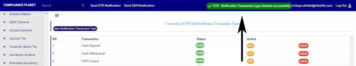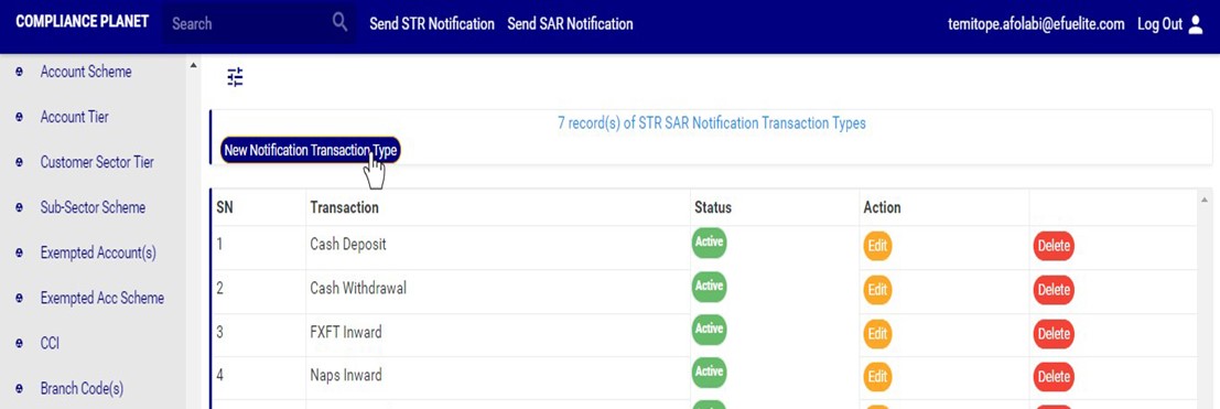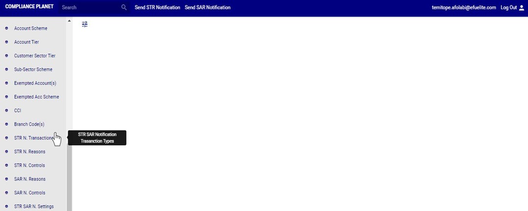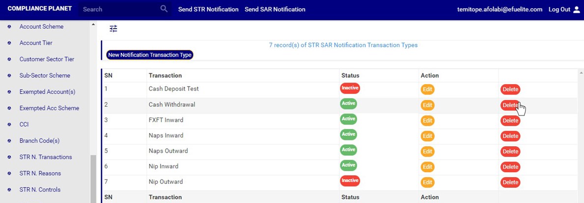 ➔ An active transaction type will form part of the available options when sending a new STR notification on the compliance planet (See section 6.2.1 for sending an STR notification) while an inactive transaction type will no longer be part of the available options when sending a new STR notification on the compliance planet.