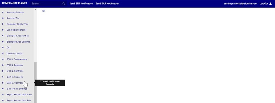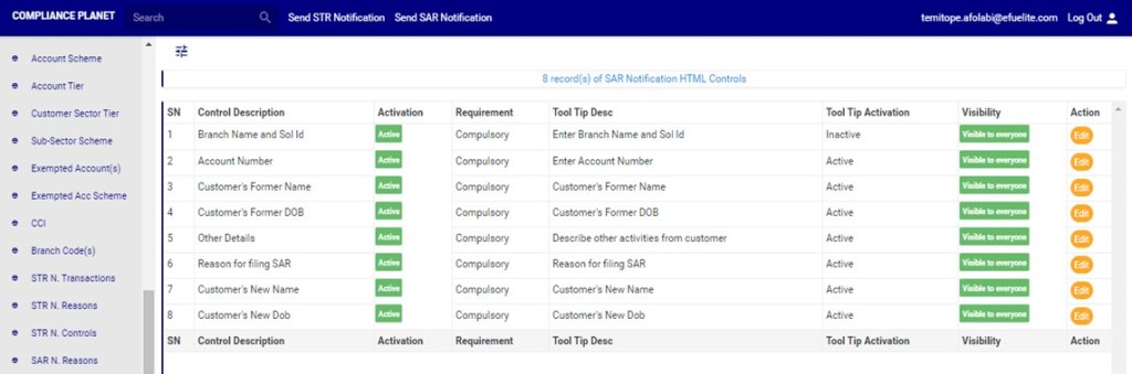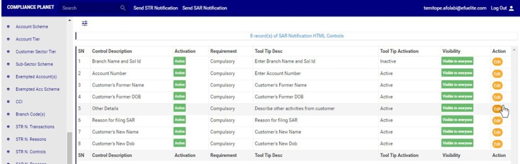 Clicking on ‘SAR N. CONTROLS’ will display a page showing a list of all SAR notification controls and their status, requirement, tooltip description, tooltip activation and visibility. See fig. 24.1c below for an example.