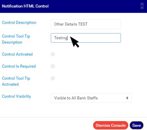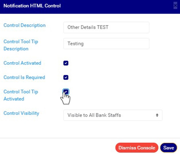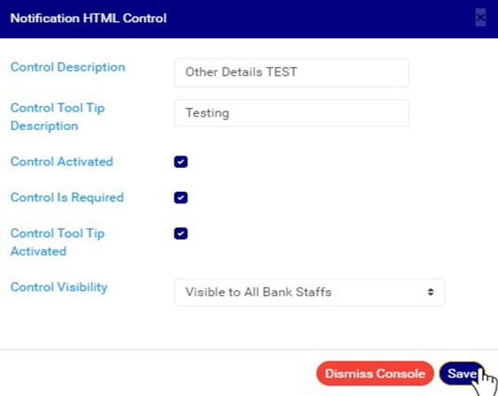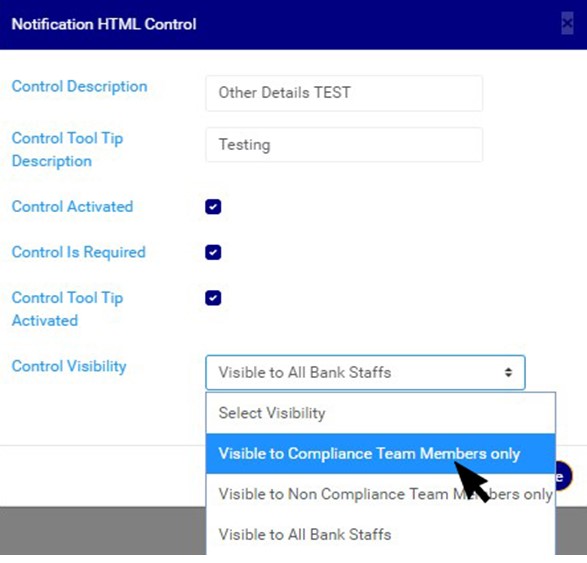 STEP 9: Click on ‘CONTROL VISIBILITY’ to select those that can see the control i.e. you can make the field visible to compliance team members only, non-compliance team members only, or all bank staffs. See an example in fig. 24.1k below