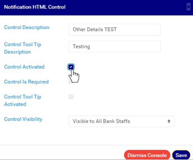 STEP 6: Click on ‘CONTROL ACTIVATED’ checkbox as in fig. 24.1h below to activate the control, note that unchecking this checkbox will deactivate the control and make it unavailable in the SAR notification console.