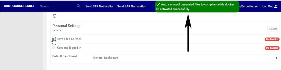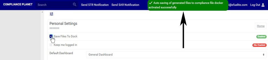 This refers to enabling or dis-enabling the auto-saving of generated files to the Compliance planet software file dock. To activate or deactivate auto-save for generated files to the file dock, click the ‘SAVE FILES TO FILE DOCK’ checkbox.