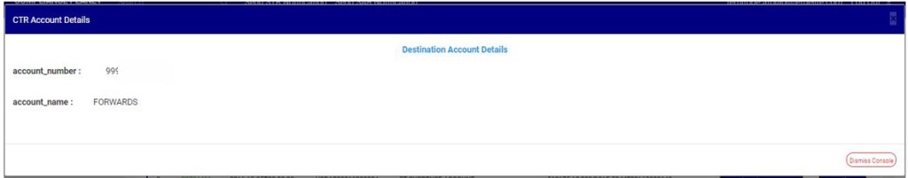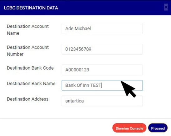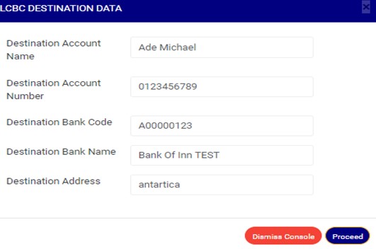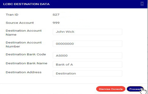 - Click on ‘Proceed’ to add the Destination account data or ‘dismiss console’ to dismiss the operation. See an example in Fig 32.2aa below