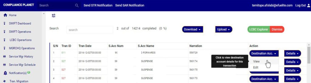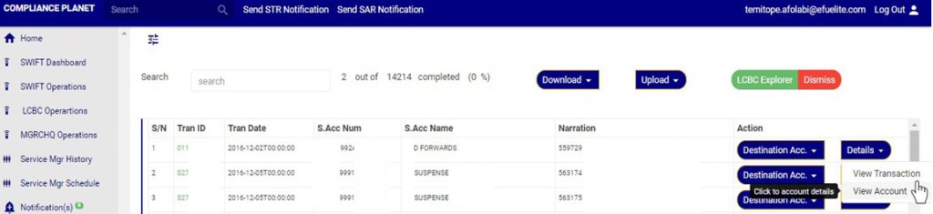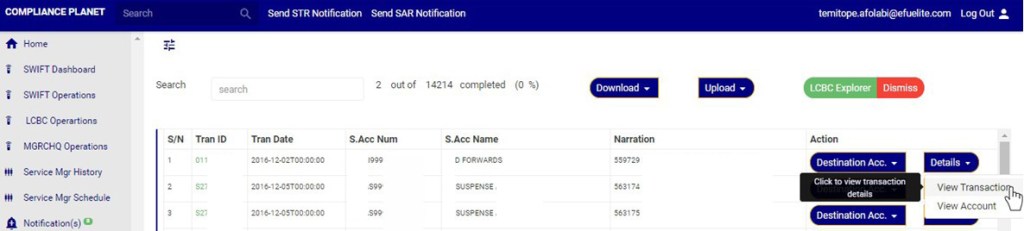 - click on ‘Details’ button on the Action column, this will display a drop down with option to ‘VIEW Transaction’ and ’View Account’. See an example in fig 32.2ad