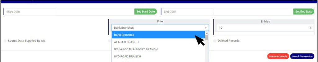 STEP 3: Click on the ‘filter’ box to select a bank branch. (See the example in fig. 32.2e). If you want to see the transactions for all branches, select bank branches. It is the first option on the filter list.