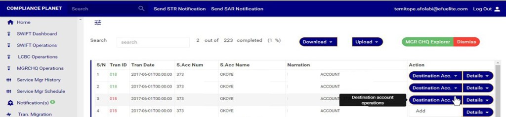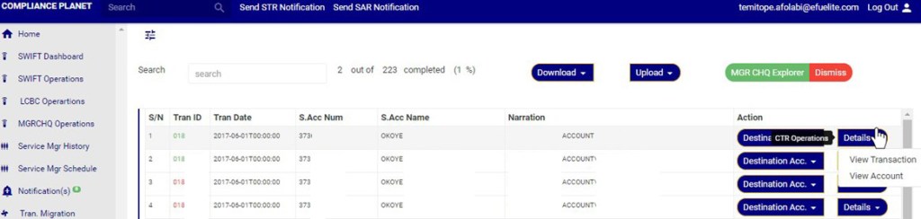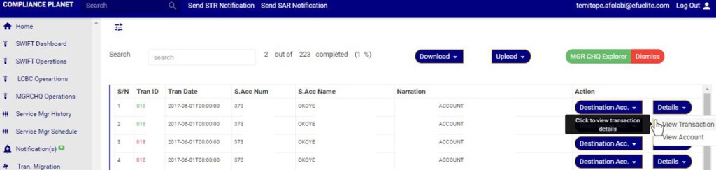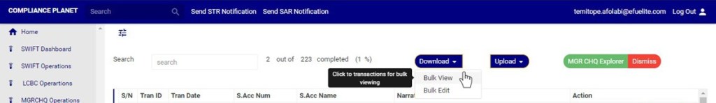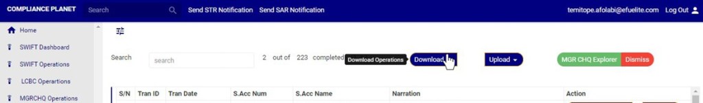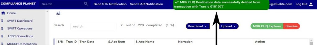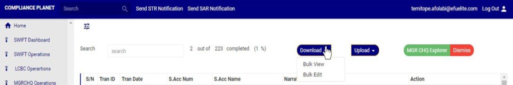 - An excel file with details of the Manager’s Cheque transaction will be downloaded when the process is complete. The data on the downloaded excel file can be edited and uploaded on the software to update multiple Manager’s transaction details at once. However, the ‘Compliance tran Id’ for each record on the excel file must not be tampered with for the upload to be successful.