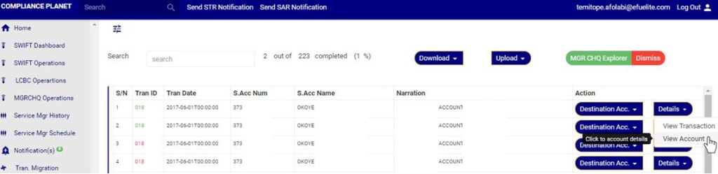 - On the MANAGER’s CHEQUE Explorer page, click on ‘Details’ button on the Action column, this will display a drop down with option to ‘VIEW Transaction’ and ’View Account’. See an example in fig 33.2ac