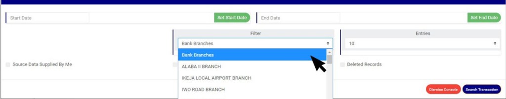 STEP 3: Click on the ‘filter’ box to select a particular bank branch. If you want to see the transactions for all branches, select bank branches. It is the first option on the filter list.