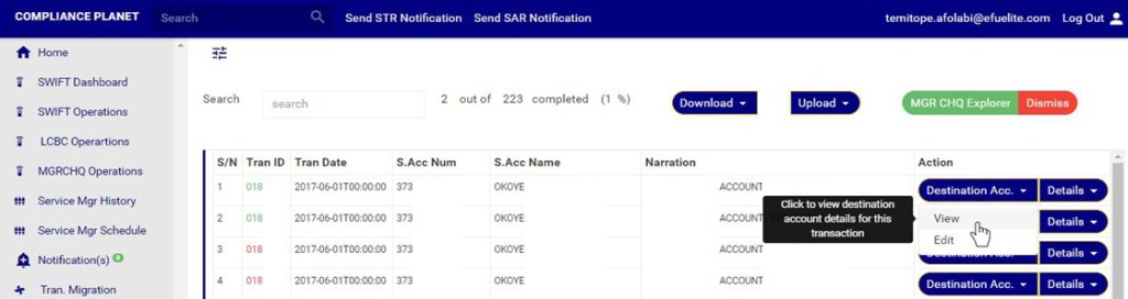 - On the destination Acc. Dropdown, click on ‘VIEW’ to see the destination account data for this transaction. As in fig 33.2l below