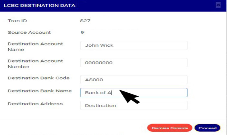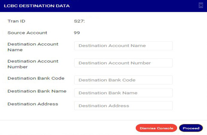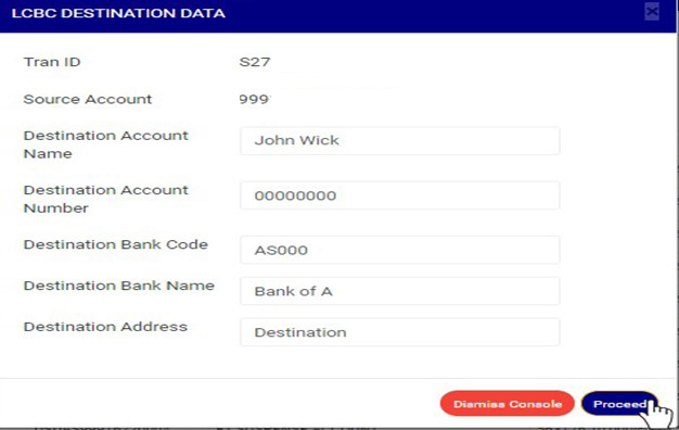 - Click on Proceed to add the Destination account data or ‘dismiss console’ to dismiss the operation. See an example in Fig 33.2z below