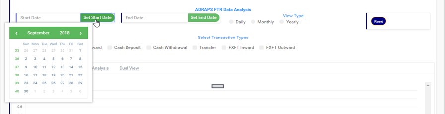 - Once you select any start date, end date and you mark any transaction for analysis, the software processes the details of the transaction selected right away, so, you cannot undo any setting you have made. You can only switch between volume and value analysis and change your view type. To make new settings for a fresh analysis, click on the RESET button. The software will wipe off all your previous selections. See fig. 3.6l below to view the Reset button. It is next to the View Type buttons