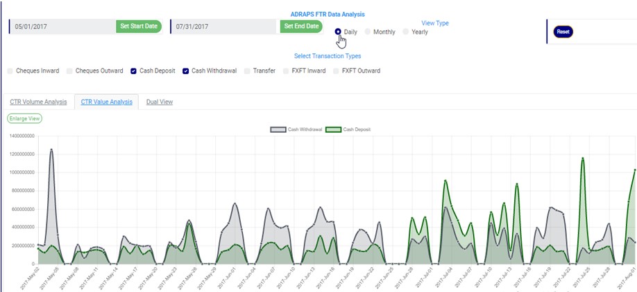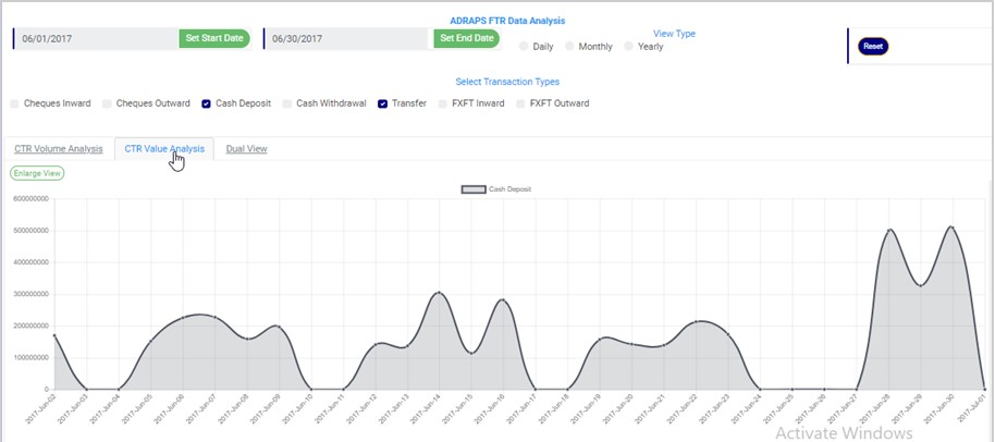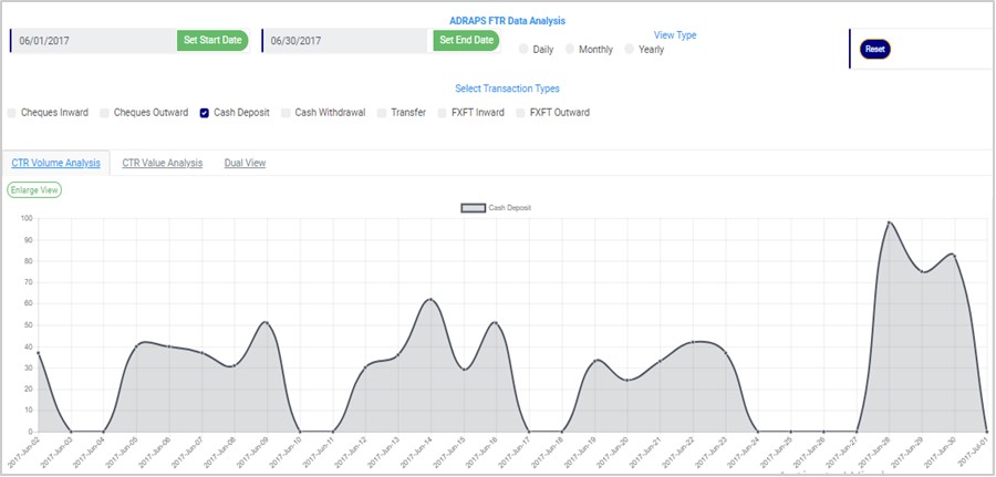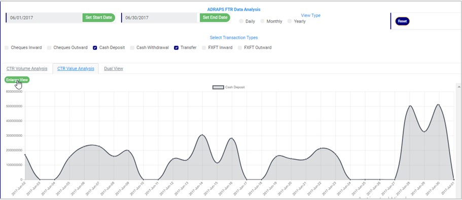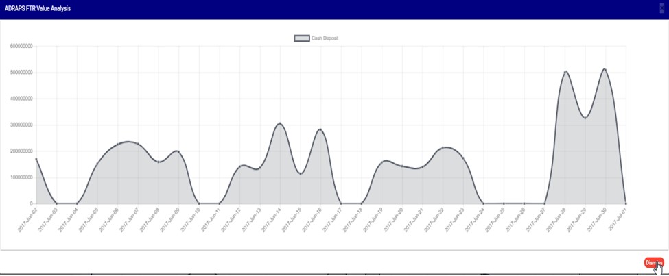 STEP 5: Tick the checkbox ◻ of the FTR type(s) you want to view. As soon as you select a transaction type, the software processes it and displays a graph instantly. Fig. 3.6e below is an example for Cash Deposit ADRAPS FTR for 1st of June, 2017 to 30th of June, 2016.