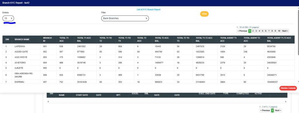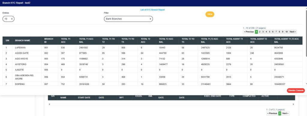 - The numbers under the Branch Rpt column represent the branches reported in the KYC report. Click on “BRANCH RPT”, a page titled Branch KYC Report will appear. This page gives information about the branch’s ID, number of tier one and tier two accounts, total account balances, and number of accounts that moved from one tier to another for each branch reported in the ADRAPS KYC. See Fig. 5.4j below.