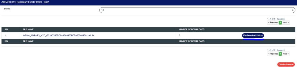The KYC Repository Excel file(s) page gives information about the Excel file name(s), the number of times users have downloaded the file, and the download history. It has various features, and here are the following steps on howto use them: