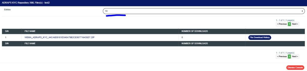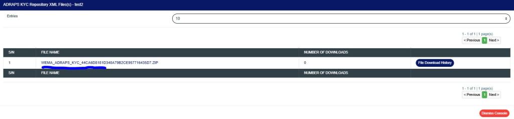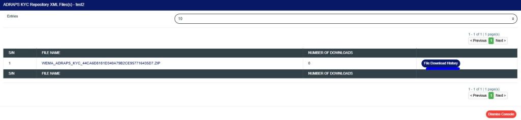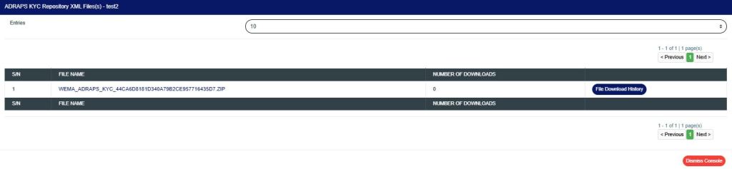 The KYC Repository XML file(s) page also gives information about the XML file name(s), the number of times users have downloaded the file(s), and the download history. The features on the KYC Repository XML file(s) page function similarly to those on the KYC Repository Excel file(s) page.