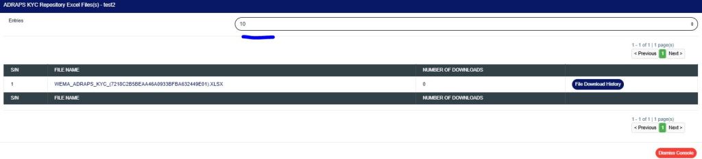 Click the ‘File Download History‘ button to see who downloaded the file and the download time. A small console will be displayed on the page, as in Fig. 5.4u below. Close the console using the DISMISS button at the bottom-right corner of the console.