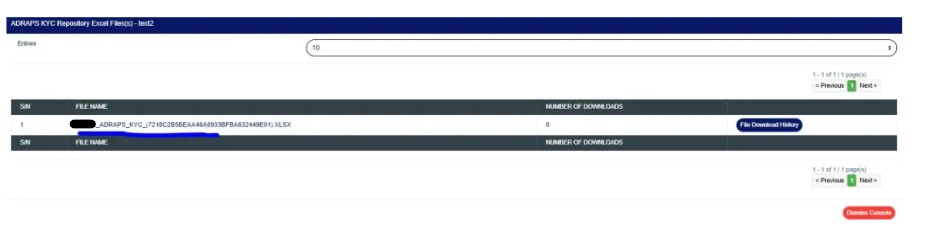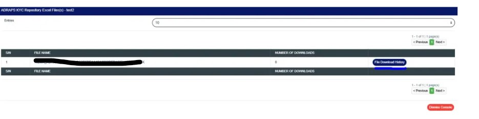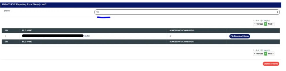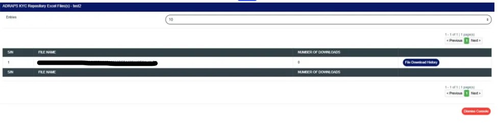 The KYC Repository Excel file(s) page gives information about the Excel file name(s), the number of times users have downloaded the file, and the download history. It has various features, and here are the following steps on howto use them: