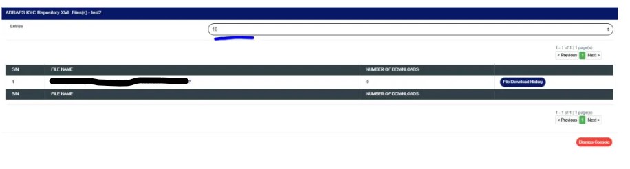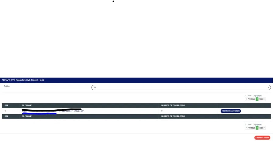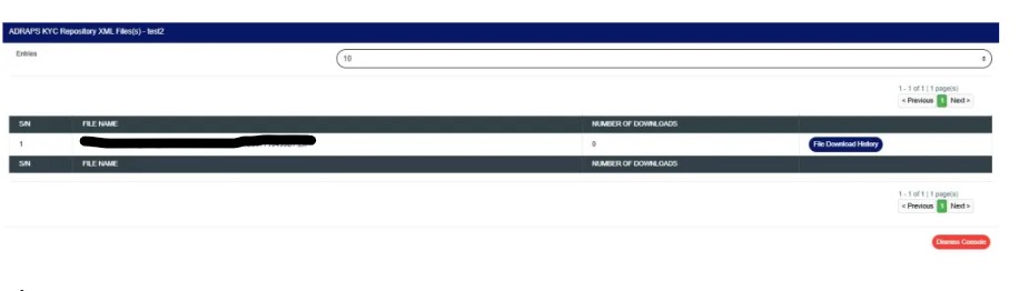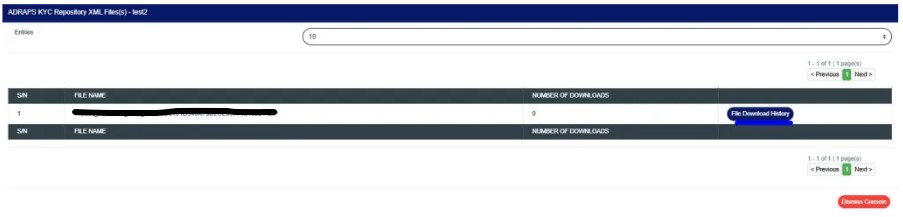 The KYC Repository XML file(s) page also gives information about the XML file name(s), the number of times users have downloaded the file(s), and the download history. The features on the KYC Repository XML file(s) page function similarly to those on the KYC Repository Excel file(s) page.