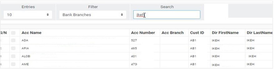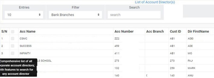 - You can search for director information by typing the account name, account number, director’s first name, last name or director’s BVN in the search box. See an example in fig. 10.4e below.