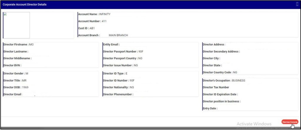 - This will display a Corporate Account Director Details console as in fig. 10.4g below. After viewing, click on ‘DISMISS CONSOLE’ (as shown below) to close the console.